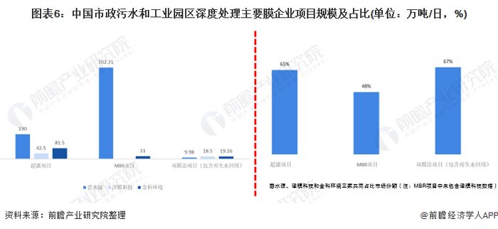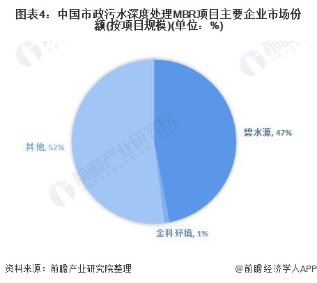 从中国市政和工业园区污水深度处理主要企业项目规模来看,市场集中度较高,不论是从超滤项目、MBR项目、或是双膜法项目(包含再生水回用),碧水源、津膜科技和金科环境三家总占比在50%左右。