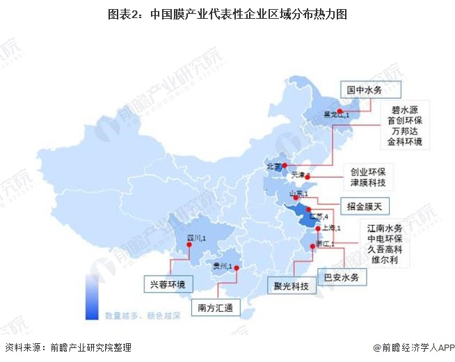 本文核心数据:中国膜产业代表性企业区域分布热力图,膜法水处理市场份额,中国市政污水和工业园区深度处理主要膜企业市场集中度,膜产业领先企业技术比较