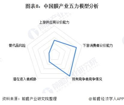 从五力竞争模型角度分析,可以看到膜产业行业竞争较为激烈。根据以上分析,对各方面的竞争情况进行量化,1代表最大,0代表最小,我国膜产业行业的整体竞争情况如下图所示: