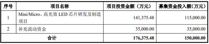 乾照光电本次拟募集15亿元资金,其中11.5亿元将投向Mini/Micro LED、高光效LED芯片研发及制造项目,3.5亿元用于补充流动资金。