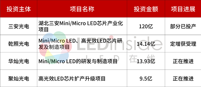 截至目前,LED芯片领域的主要扩产项目均取得了不同程度的进展,未来中高端芯片市场总产能水平将显著升级。