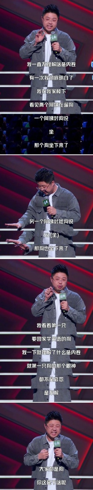 呼兰也拿出一个有深度文本,忙着内卷的我们,就是段子里的鹦鹉、狗和猴。“大家都是狗,你这是干啥呢”,能够get到的观众,会体悟到段子背后那一股无奈的悲凉。