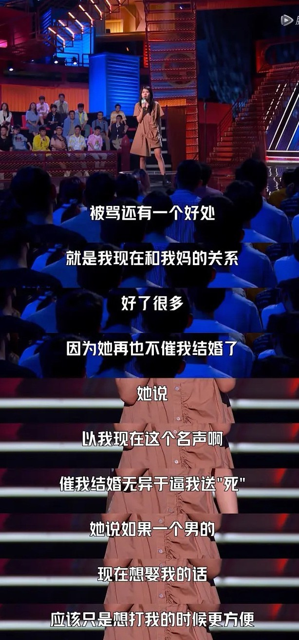 杨笠说:“我现在和我妈的关系好了很多,因为她再也不催我结婚了。她说以我现在这个名声,催我结婚无异于逼我送‘死’。她说如果一个男的现在想娶我的话,应该只是想打我的时候更方便。”杨笠的这个段子现场没响,但微博上引发广泛共鸣。