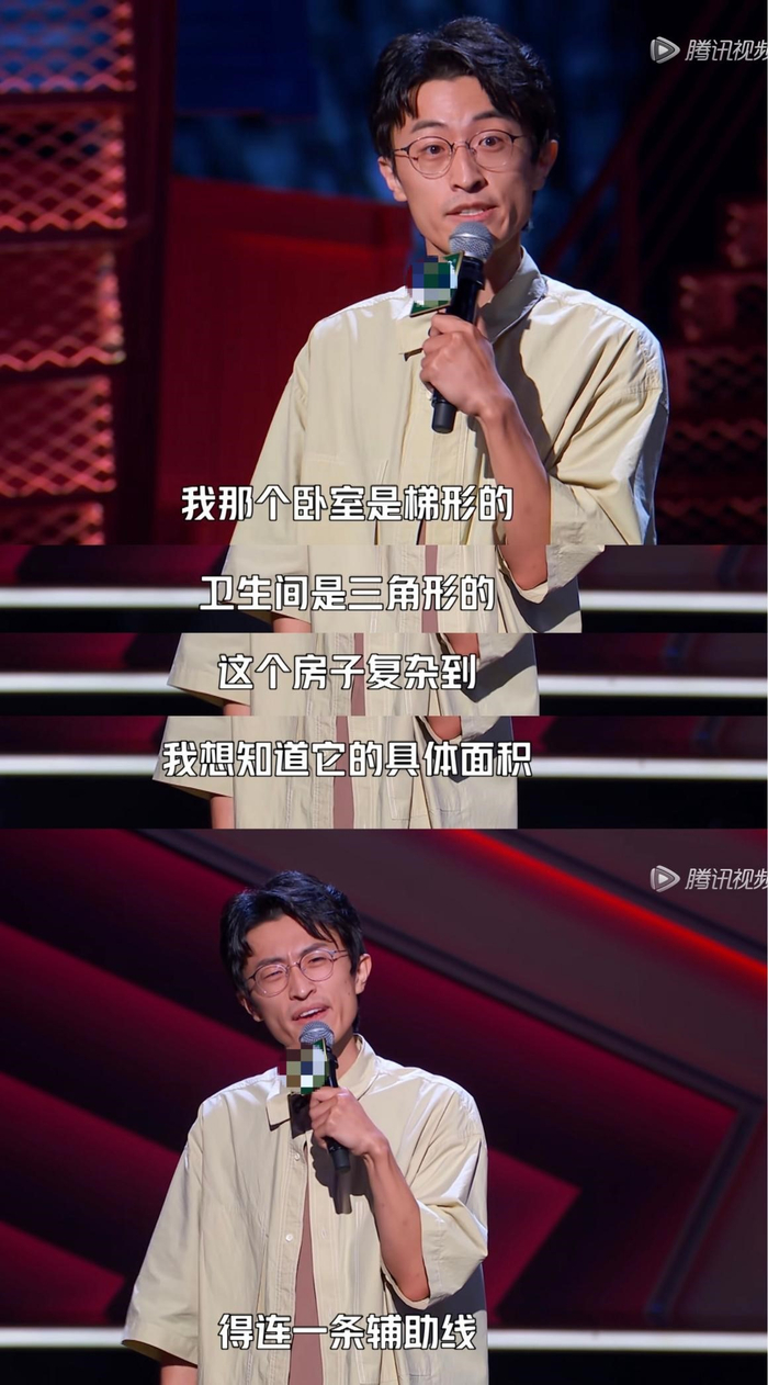 邱瑞吐槽自己“北漂”租房时遭遇的奇葩经历和奇葩户型,见识了别样的一居室,还有最奇葩的钻石房,梯形的卧室、三角形的卫生间,甚至在房间里都找不到一个直角……就像罗永浩表扬的,在他身上看到老艺术家的一种独特的创造能力,“就是拿着一个事,能无限地往下延展下去”。