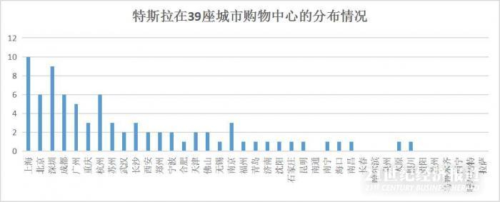 作为全球新能源汽车代表的特斯拉,尽管对城市的覆盖率略高于威马汽车,但在29座城市的购物中心开设门店数量低于威马汽车,仅79家门店。