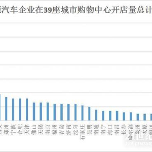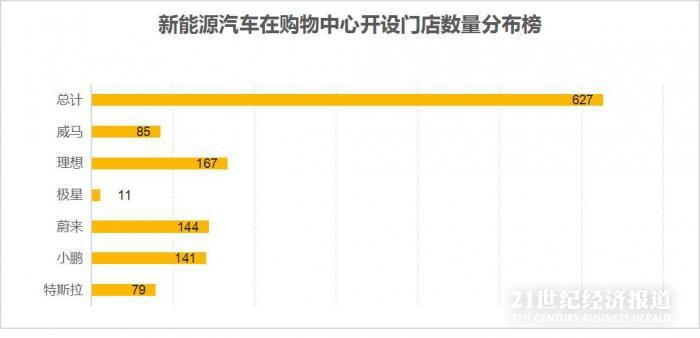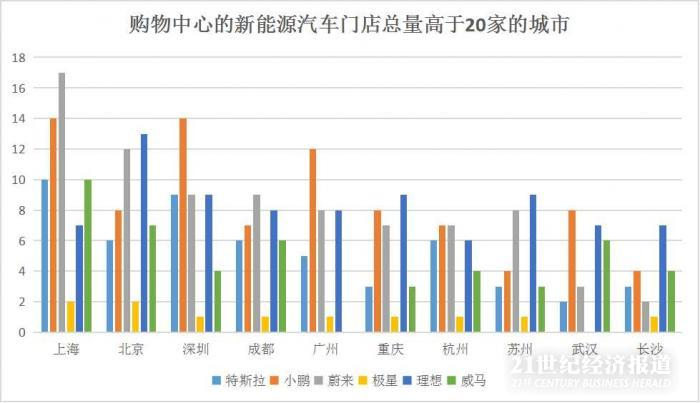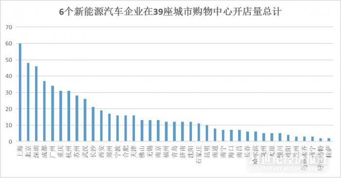 据21世纪经济研究院统计,在39座城市中,6家新能源汽车企业在不同的购物中心内共开设了627家门店。其中有10座城市的购物中心开设的新能源汽车门店数量超20家。