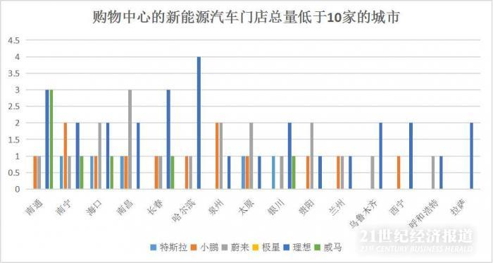 为了解新能源汽车门店在国内主要城市购物中心的分布情况,21世纪经济研究院选择全国31省(直辖市、自治区)的省会(首府)城市,以及非省会/首府的万亿GDP城市,对特斯拉、小鹏、蔚来、极星、理想、威马6个汽车企业在购物中心内的开店情况进行了统计。