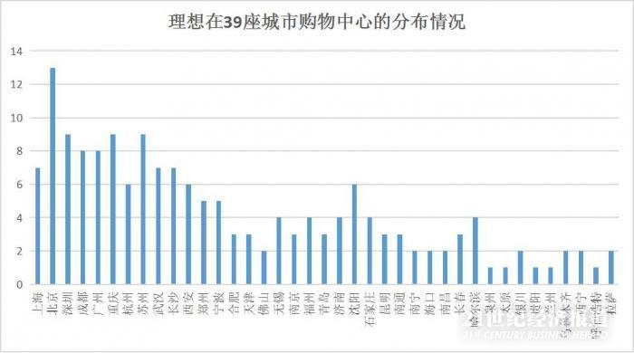从对城市购物中心的覆盖率看,在纳入21世纪经济研究院统计范畴的6家新能源汽车品牌中,仅理想汽车实现了对39座城市的全覆盖。在这些城市的购物中心中,理想汽车一共开设了167家门店,理想汽车也成为覆盖率最高的新能源汽车品牌。