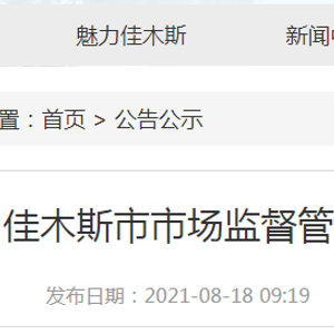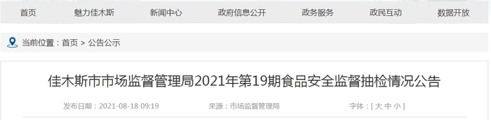 原标题:黑龙江省佳木斯市市场监管局发布2021年第19期食品安全监督抽检情况