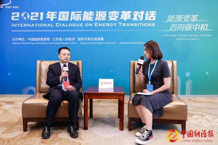▲在2021年国际能源变革论坛期间,国网(苏州)城市能源研究院院长李伟阳接受媒体采访