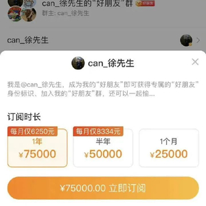 中新经纬(微信号:jwview)在徐勤根的微博配图中看到,其粉丝群的入门门槛并不低:每人每年7.5万元,半年5万元,1个月的的费用也高达2.5万元。