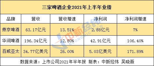 “V观财报”(微信号ID:VG-View)梳理财报发现,从上半年净利润来看,华润啤酒以42.91亿元拔得头筹,百威亚太以5.03亿美元(约合人民币32.6亿元)次之,燕京啤酒2.88亿元位居第三。从净利润增速来看,燕京啤酒仍然垫底,百威亚太位列第一。