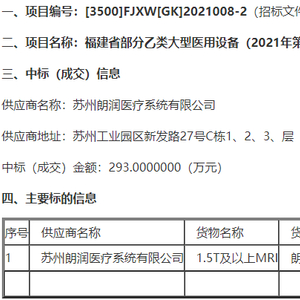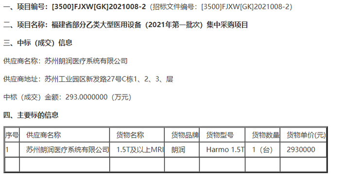 大型设备又要集采了!近日,国务院医改领导小组秘书处、国家卫生健康委就推广三明医改经验举行的发布会上,福建省卫生健康委党组书记、主任黄如欣介绍,福建省在三明医改经验的总结和推广中深化“三医”联动,CT、MRI等大型设备省级集采成功破题,平均降价均50%以上。不久前,福建省部分乙类大型医用设备(2021年第一批次)集中采购项目中标公告中,苏州朗润的1.5T及以上MRI中标价甚至达293万元,比去年安徽省集采价格还要低!