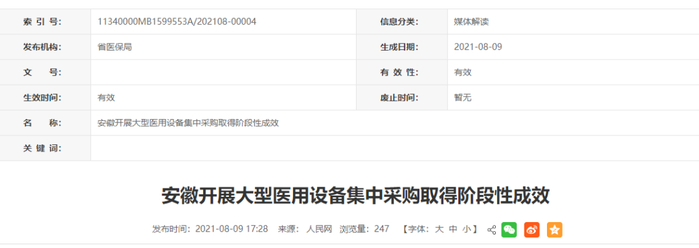 2020年12月,安徽省医保局就全省乙类大型医疗设备集采征求意见文件中明确提出:市县级以上公立医院,第2台及以上大型医疗设备配置,在实际执行落地时原则上全部选择国产;市县级以下的公立医院首台配置就要选择国产。