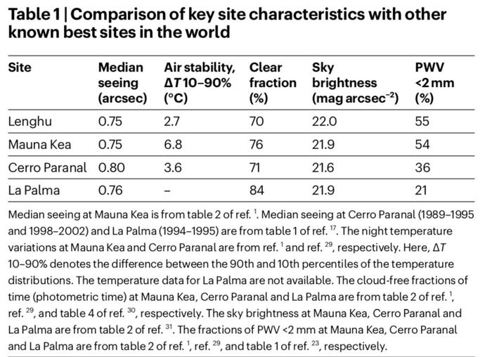 在其他数据方面显示,冷湖台址夜间可沉降水汽柱密度在2毫米以下的时间占比(55%)优于Mauna Kea(54%),远优于智利和其它地区的大型光学天文台。