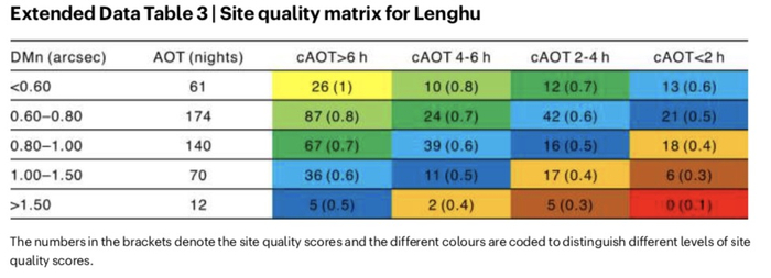 邓李才等人认为,视宁度和晴夜质量俱佳,则是考虑未来潜在观测点时的一个关键参数。为了定量评价冷湖观测点的质量,他们根据每晚连续可用观测时间(cAOT)的长度和DIMM视宁度的中位数定义了观测点质量矩阵。