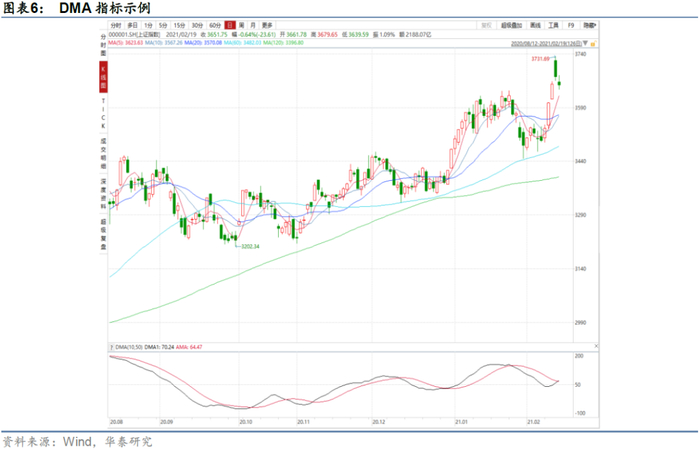 我们以DMA指标为例,介绍均线类指标中应用切线原则判断多空信号的方式。Wind中同样分情形给出了基于动量逻辑和反转逻辑的信号识别方式,但通过实证检验,我们采用动量逻辑下的切线原则生成信号,具体方式为:当DMA和AMA均大于0,并向上移动时,发出1信号;当DMA和AMA均小于0,并向下移动时,发出-1信号;其他时间维持原仓位。