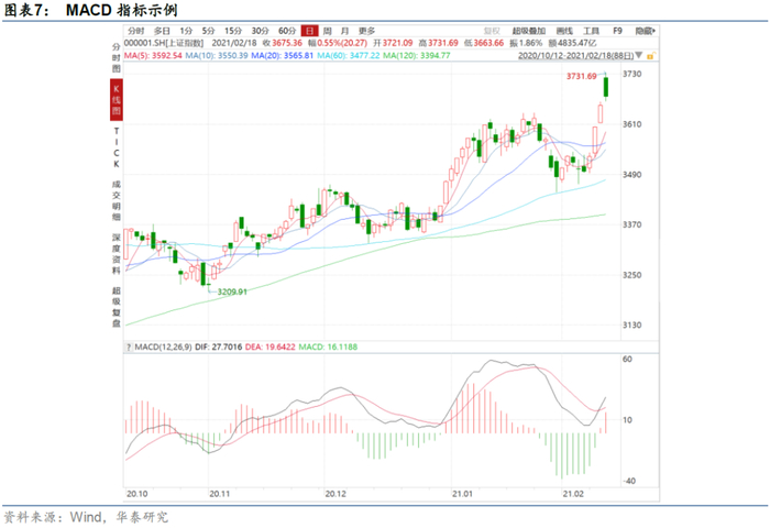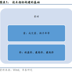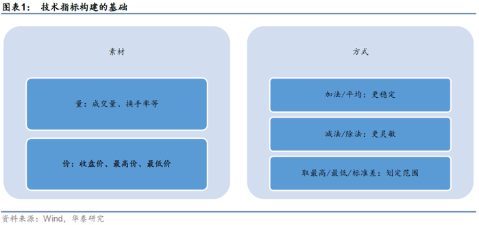 以下我们首先介绍技术指标的构建方式。我们对Wind金融终端所展示的若干技术指标进行汇总分析发现,技术指标虽然纷繁复杂,但本质上大部分是基于量价数据的简单加工。构建的素材无外乎基于量或者价格数据,“量”的维度,包括换手率、成交量等,其中成交量使用居多;“价”的维度,包含开、高、低、收等,其中,收盘价使用居多。而构建方式大多为简单运算,并没有用到复杂的数据处理方法,例如,通过加减乘除计算均线、涨跌幅;通过最大最小值的比较确定价格运动的合理范围等。