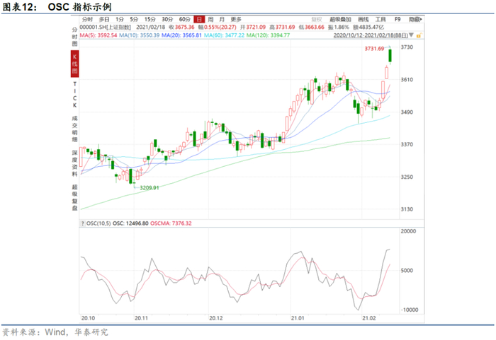 OSC摆动量构造思想同BIAS相近,反映的是股价与移动平均价的偏离的绝对距离。其构建方法为: