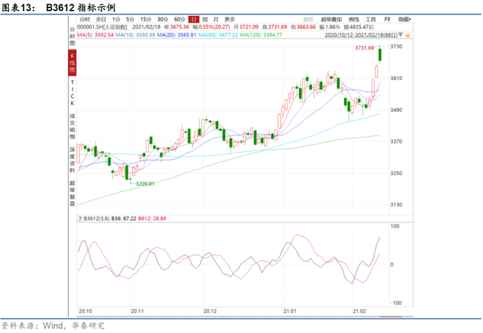 B3612乖离指标考虑不同周期的移动平均线之间的差距,3日平均数值与6日平均数值之间的差值为B36,6日平均数值与12日平均数值之间的差值为B612。该指标以长期均线为参考线,以短期均线为当前状态代表,衡量短期和中期投资者获利的相对状态,进而评估短、中期投资者对后市的看法。其构建方法为: