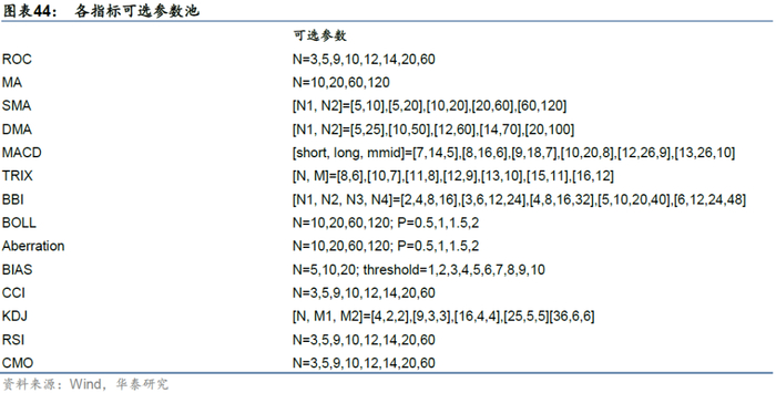 在参数集合设置方面,我们遵循以下几个原则。1:尽量不改变参数之间的相对量级,例如,原参数组合存在固定9 3 3的关系,则新的参数组合采用16 4 4或者25 5 5 等;2:新的参数组合和原有参数组合体现一定的时间周期差异,如BOLL(布林带)策略中,默认参数取N为20日,新的参数组合中N可取10 20 60 120,分别对应半月、单月、三个月、半年的时间周期,与原先参数有一定差异;3:参数组合不宜过多,每个技术指标选取10组左右构成可选参数集合。各指标的可选参数池如下表所示。