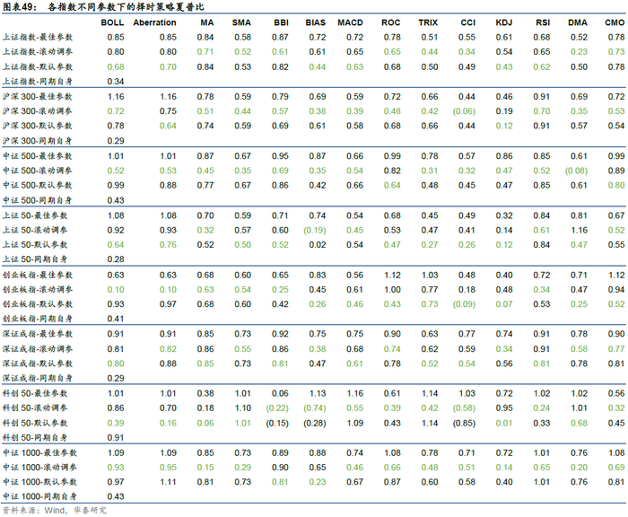 如此滚动寻优,最后将所有历史阶段的最优参数样本外回测结果拼接在一起,对比同期仅使用默认参数的表现。如果滚动寻优结果超过默认参数,则认为寻优有效,否则认为寻优无效。为了避免单一指数或指标可能造成的样本误差,我们对每一组指数×技术指标组合,均应用此方法,并统计默认参数和滚动寻优后的优化参数占优的概率。下表中,绿色字体代表该指数三种参数状态回测下择时夏普的最小值,可以直观看出相较于默认参数,滚动调参择时效果并不占优。