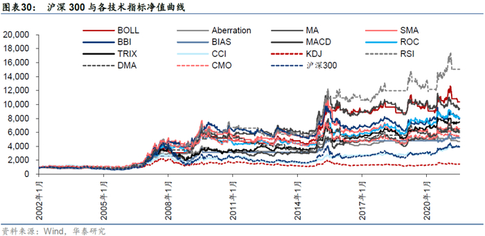 对于沪深300,回测时间为2002/01/07-2021/07/21,各个技术指标和指数自身走势如下,92.9%的技术指标择时夏普超过指数自身。