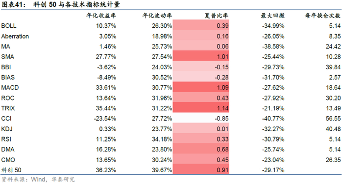 对于科创50,回测时间为2020/01/02-2021/07/21,各个技术指标和指数自身走势如下,21.4%的技术指标择时夏普超过指数自身。由于该指数存续历史较短,技术指标对其择时效果较差。