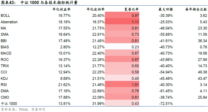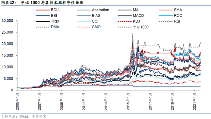 对于中证1000,回测时间为2005/01/04-2021/07/21,各个技术指标和指数自身走势如下,85.7%的技术指标择时夏普超过指数自身。