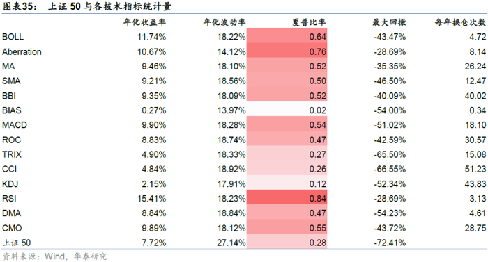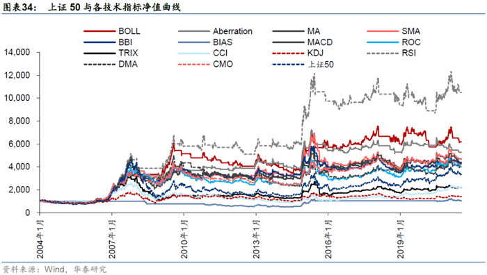 对于上证50,回测时间为2004/01/02-2021/07/21,各个技术指标和指数自身走势如下,71.4%的技术指标择时夏普超过指数自身。