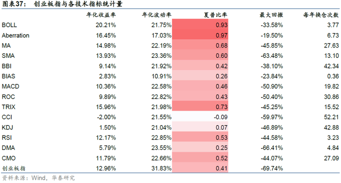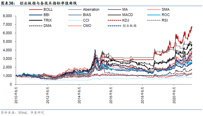 对于创业板指,回测时间为2010/06/01-2021/07/21,各个技术指标和指数自身走势如下,71.4%的技术指标择时夏普超过指数自身。