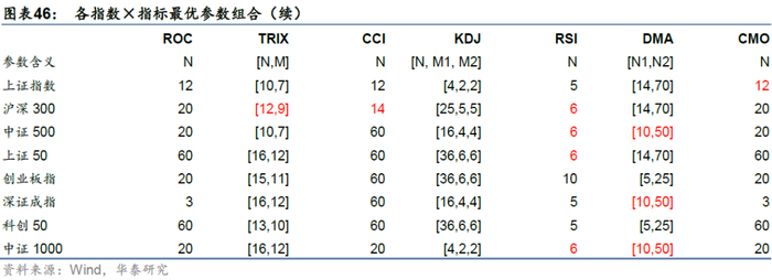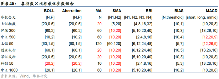 毫无疑问,全局寻优在包括默认参数在内的参数集合中选取夏普最优,其表现远超同期指数自身和默认参数。下图中,红色字体代表最优参数为默认参数的情形,可以看出相当数量指数×指标组合下的参数存在优化空间。