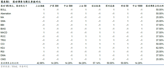 更进一步,通过统计分析,如下表所示,14个技术指标中,仅有1个指标的滚动调参占优比例超过50%,在8个指数中,仅有2个指数的滚动调参占优比例超过50%,在所有技术指标×指数组合中,仅有38.4%的组合调参后的效果优于默认参数。因此我们认为,对于技术指标的择时,推荐使用默认参数。根据历史回测的滚动调参大概率不能起到优化效果。