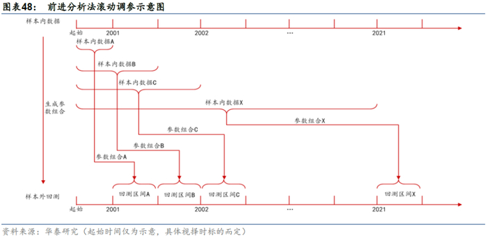 全局寻优的最优参数虽然可以获得比默认参数更好的表现,但这种寻优方案严重依赖于历史数据,有较高的数据挖掘嫌疑,未来真实的样本外回测中,可能会产生过拟合(我们将其简单定义为,表现不及默认参数)。为了检验其过拟合风险,我们应用“前进分析法”,考察这种寻优方案的可靠性。