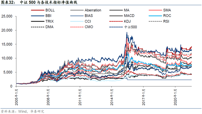 对于中证500,回测时间为2005/01/04-2021/07/21,各个技术指标和指数自身走势如下,92.9%的技术指标择时夏普超过指数自身。