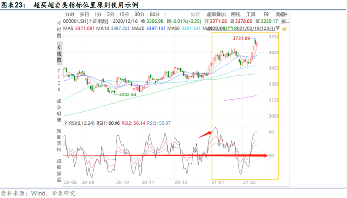 后续实证分析中,我们衍生引入CMO指标,该指标与RSI指标构建方式类似,分母相同,将分子替换为N日内收盘价涨跌幅度之差。使用方法详见后文图表29。