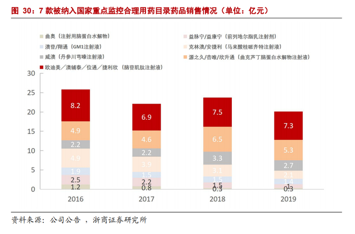 政策影响拐点已现,重点监控目录产品占比持续下滑。2019 年公司有 7 款药品进入国家重点监控合理用药药品目录,分别是曲奥(注射用脑蛋白水解物)、益脉宁/益康宁(前列地尔脂乳注射剂)、澳苷/翔通(GM1 注射液)、克林澳/安捷利(马来酸桂哌齐特注射液)、威澳(丹参川芎嗪注射液)、源之久/杏唯/欣升通(曲克芦丁脑蛋白水解物注射液)、欧迪美/澳辅泰/位通/捷利欣 (脑苷肌肽注射液),导致公司营业收入有所下滑,并于 2019年计提了 28.4 亿元的商誉减值。截至 2020 年,公司被纳入监控目录的 7 款药品占公司营收大幅减少至 6.7 亿元,同比下滑 67%,占总营收比重下滑至 27%。根据公司最新盈利预告,21H1 公司营收及利润分别较同期大幅增长了 80%及 300%,政策冲击拐点已现。