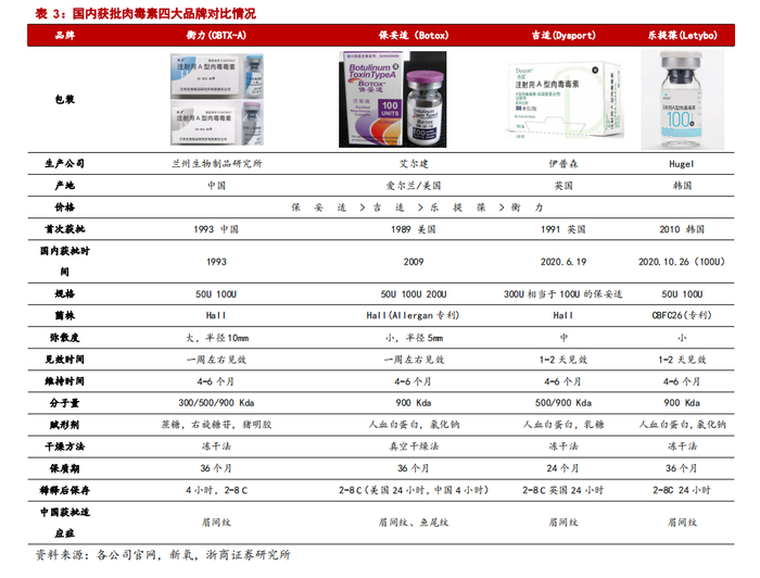 吉适、乐提葆陆续入局,四强争霸格局初显,将加剧行业竞争。吉适、乐提葆分别于2020 年 6 月、10 月获批,目前国家药品监督局批准的肉毒素药物共有四大品牌:衡力、保妥适、吉适、乐提葆。我们认为,随着吉适、乐提葆的引入,国内肉毒素市场双龙头的格局或将受到冲击。从产品定位情况来看,乐提葆将直接冲击衡力的市场,吉适将直接冲击保妥适的市场。
