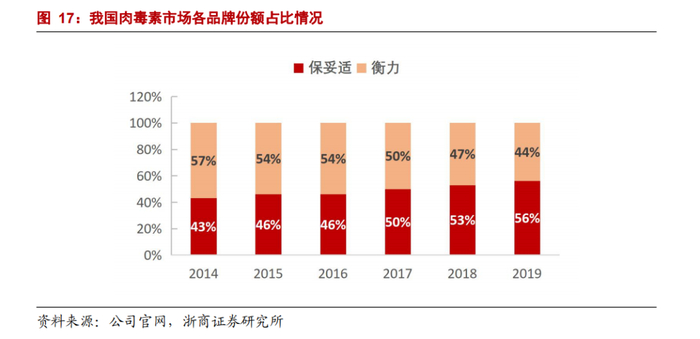 “双龙头”占据先发优势。由于衡力、保妥适获批较早,占据了此前国内肉毒素市场主要的市场份额。参考智研咨询数据,保妥适的市场份额由 2014 年的 43%增长至 2019年的 56%,超过衡力的 44%,占据了市场的主导地位。