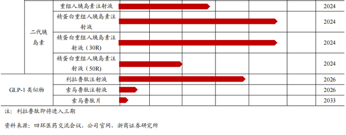 产品矩阵丰富,核心产品进展迅速。惠升生物拥有以德谷胰岛素为代表的 15 项胰岛素及合剂,覆盖二代到四代基础及速效产品。其中拳头产品第四代德谷胰岛素已完成 III期临床入组,第二代门冬 30 胰岛素已完成临床 III 期,并有望于 2022 年报产。重磅产品德谷门冬双胰岛素已成功获得国家药品监督管理局颁发的药物临床试验批件,研发进展在生物类似物中处于国内首位。公司自研的生物类似药门冬胰岛素 30 注射液和门冬胰岛素 50 注射液已经完成临床 III 期,正在进行 NDA 申报准备。同时,公司还拥有以利拉鲁肽、索马鲁肽为代表的的新型长效、口服 GLP-1 类似物。其中利拉鲁肽项目,开发适应症为 2 型糖尿病和肥胖的治疗,目前已经完成了 I 期临床研究,并初步获得了药代动力学和药效学的生物等效性结果,不久将进入临床 III 期阶段。