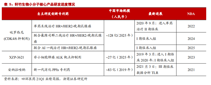 产品管线丰富。目前公司有超过 25 个在研创新项目,其中即将 NDA 的产品 2 个,进入临床 I-III 期阶段的产品 11 个,治疗领域涵盖了肿瘤、代谢、抗感染、消化、男性健康等;公司旗下产品治疗晚期乳腺癌的 CDK4/6 抑制剂吡罗西尼,其末线适应症目前正在开展单药注册性临床;联合氟维司群的 1 线治疗已获批开展 III 期临床试验;新一代消化疾病用药安纳拉唑钠已完成临床 III 期;ALK/ROS1 双靶点抑制剂 XZP-3621 末线适应症已进入单药注册性临床,1 线适应症也将开始 III 期临床;NTRK/ROS1 双靶点抑制剂 XZP-5955 进入临床 I 期。