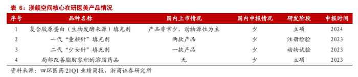 打造医美产品自主研发能力。公司在美国南加州成立了医美产品研究院,内部有 10余款医美自研产品项目在推进,其中包括胶原蛋白类产品、可吸收聚酯类产品(“童颜针”、“少女针”)以及局部改善脂肪容积的溶脂药品,预计公司自研产品童颜水凝有望于 2022年上市;同时,预计在 2023 年至 2025 年公司也将有多款自研产品获得注册批文。