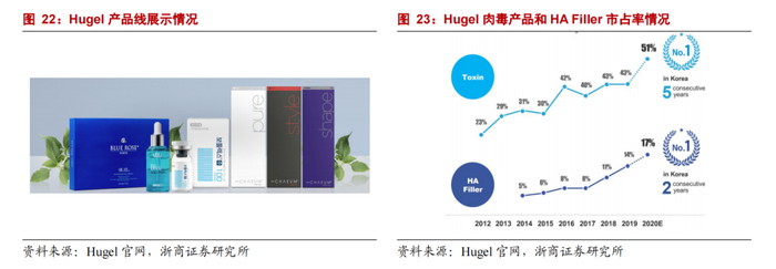韩国生产商 Hugel 实力突出,肉毒素产品连续 5 年韩国市占率第一。乐提葆生产商韩国 Hugel 旗下业务板块包括肉毒素、玻尿酸、化妆品、医疗器械。除去韩国市占率第一的肉毒素品牌乐提葆之外,公司玻尿酸业务拥有 Dermalax、The Chaeum Style、The Chaeum Pure、The Chaeum Shape 10 四大品牌,HA Filler 连续两年排名韩国第一。化妆品业务拥有 Wellage、PR4 两大品牌,医疗器械主要包括 BlueRose 手术线和各类神经介入支架。2020 年,Hugel 公司实现销售收入 2110 亿韩元(约 12 亿人民币),实现净利润 453 亿韩元(约 2.6 亿人民币)。