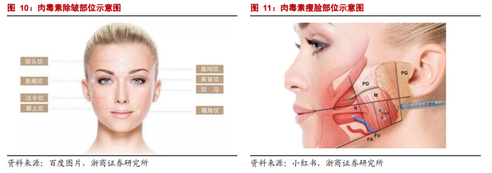 肉毒素主打两个功能:除皱、瘦脸。肉毒素的除皱功能主要针对眉间纹、抬头纹、鱼尾纹等动态皱纹。通过阻断神经与肌肉间的神经冲动,使过度收缩的小肌肉放松,进而达到除皱的效果。肉毒素还可以作用于咬肌,达到瘦脸的效果,对应的产品为瘦脸针。同时,肉毒素的应用还延伸至颈阔肌、斜方肌、腓肠肌进行轮廓肌重新塑造,实现瘦肩、瘦小腿效果。肉毒素注射后的 3-14 天即可显现效果,除皱效果通常维持在 4-6 个月。