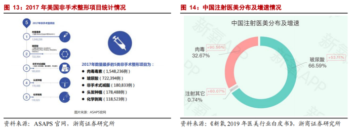 我国注射类医美项目中,肉毒素的市占率将有望进一步提升。肉毒素在美国的普及程度远超玻尿酸,根据 ASAPS 官网统计,2017 年美国非手术型项目中,肉毒素项目高达155 万例排名第一,玻尿酸 72 万例排名第二。而在我国玻尿酸占据注射类医美项目的主要市场份额,根据新氧统计,2019 年在我国注射类医美消费占比中肉毒素占比 32.67%、玻尿酸占比 66.59%。我们认为,参照美国经验来看,目前肉毒素产品在我国注射类医美消费中占比较小,份额有望持续提升。