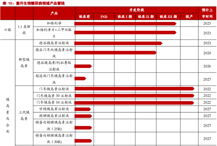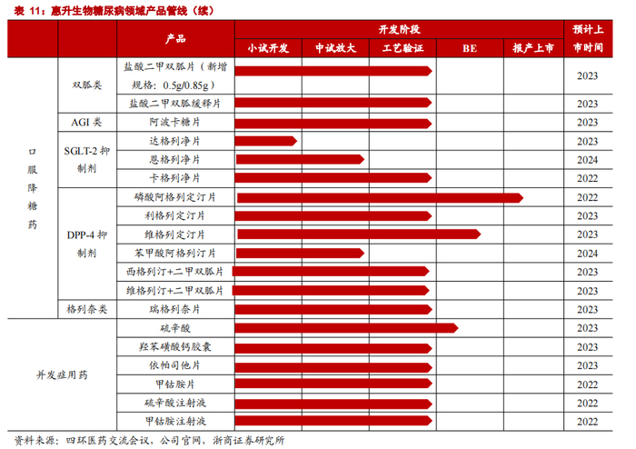糖尿病及并发症领域全覆盖的生物医药领军企业。吉林惠升生物制药有限公司,自 2014 年开始孵化,于 2019 年 5 月 17 日从四环旗下子公司剥离独立,是四环旗下全资子公司,也是四环集团内首个生物制药中试及产业化基地。公司专注于糖尿病及并发症药物的研发、生产、销售,产品涵盖了胰岛素及其类似物、GLP-1 类似物、口服降糖药等,已在糖尿病治疗领域进行了多机制、多品种的产品线布局,包括以加格列净为首的 15 项口服降糖药涵盖 SGLT-2,DPP-4,格列奈、双胍等全机制。1.1 类新药加格列净 III 期临床核心数据已锁库,正在进行 NDA 申报准备。同时,公司打造了强大的产销研体系,拥有北京生物创新药研发、临床运营团队,长春生物类似药研发团队,梅河口现代化先进生产基地。