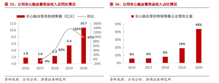 结构优化,非心脑血管药品收入持续提升。2017 以来,公司非心脑血管药品收入持续增长,营收已从 1.6 亿元增长至 2020 年的 10.7 亿元,CAGR 高达 56%,占公司总营收的比重也从 17 年的 6%大幅提升至 20 年的 44%。我们认为,未来非心脑血管药品有望进一步提升,收入结构持续改善,拉动公司整体业绩增长。