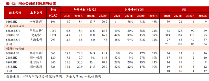 综上,我们预计公司 21-23 年收入分别为 38.5、54.7、74.1 亿元,同比增长 56%、42%、35%,对应 EPS 为 0.14、0.22、0.33 元,现价对应 PE 为 22、14、9 倍。公司 21 年目标市值为 265 亿元(对应 318 亿港元),相较当前的 196 亿元市值(对应 236 亿港元),仍有较大提升空间。考虑到公司在传统医药领域积淀深厚、切入肉毒素、玻尿酸等黄金医美细分赛道,产品差异化明显,具备长足增长潜力,首次覆盖给予“买入”评级。