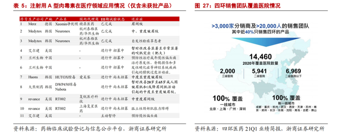 四环拥有强大的公立医院代理商机制,有望迁移到肉毒素产品销售中去。肉毒素的应用场景不仅仅局限于医美领域,也可应用于治疗颈部肌张力障碍、夜磨牙、狐臭慢性偏头痛、肌肉痉挛、眼睑痉挛、斜视、膀胱过度活动症等症状。当前,各大品牌加紧推进肉毒素在医疗领域应用的临床试验,一旦肉毒素的应用场景有所延展,四环医药在公立医院销售渠道的深厚积累将实现有效赋能。根据公司财报披露,四环销售团队在 2020 年覆盖了 14460 家医院,有超过三千家分销商和超过两万人的销售团队。