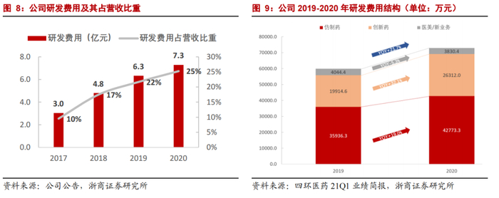 公司坚持创新驱动战略,研发投入及占比持续提升。自 2016 年开始,受到医保控费、招标降价等行业限制性政策的影响,公司积极转变经营思路,以研发创新作为驱动公司未来增长的动力。根据公司公告,2017-2020 年,公司研发投入从 3 亿元增长至 7.3 亿元,CAGR 高达 34.5%,占营收的比重也从 10%增长至 25%。其中,仿制药研发投入同比增长 19.0%、创新药研发投入同比增长 32.1%。
